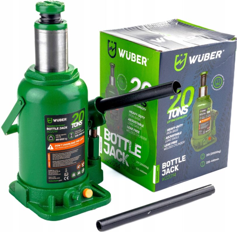 Домкрат гідравлічний 20т Wuber (Польща) — має діапазон підйому 235–440 мм, оснащений запобіжним клапаном для безпечної роботи та забезпечує плавний і стабільний підйом автомобіля. Простий у використанні механізм і складна ручка роблять цей гідравлічний домкрат Wuber зручним для транспортування та щоденного використання.