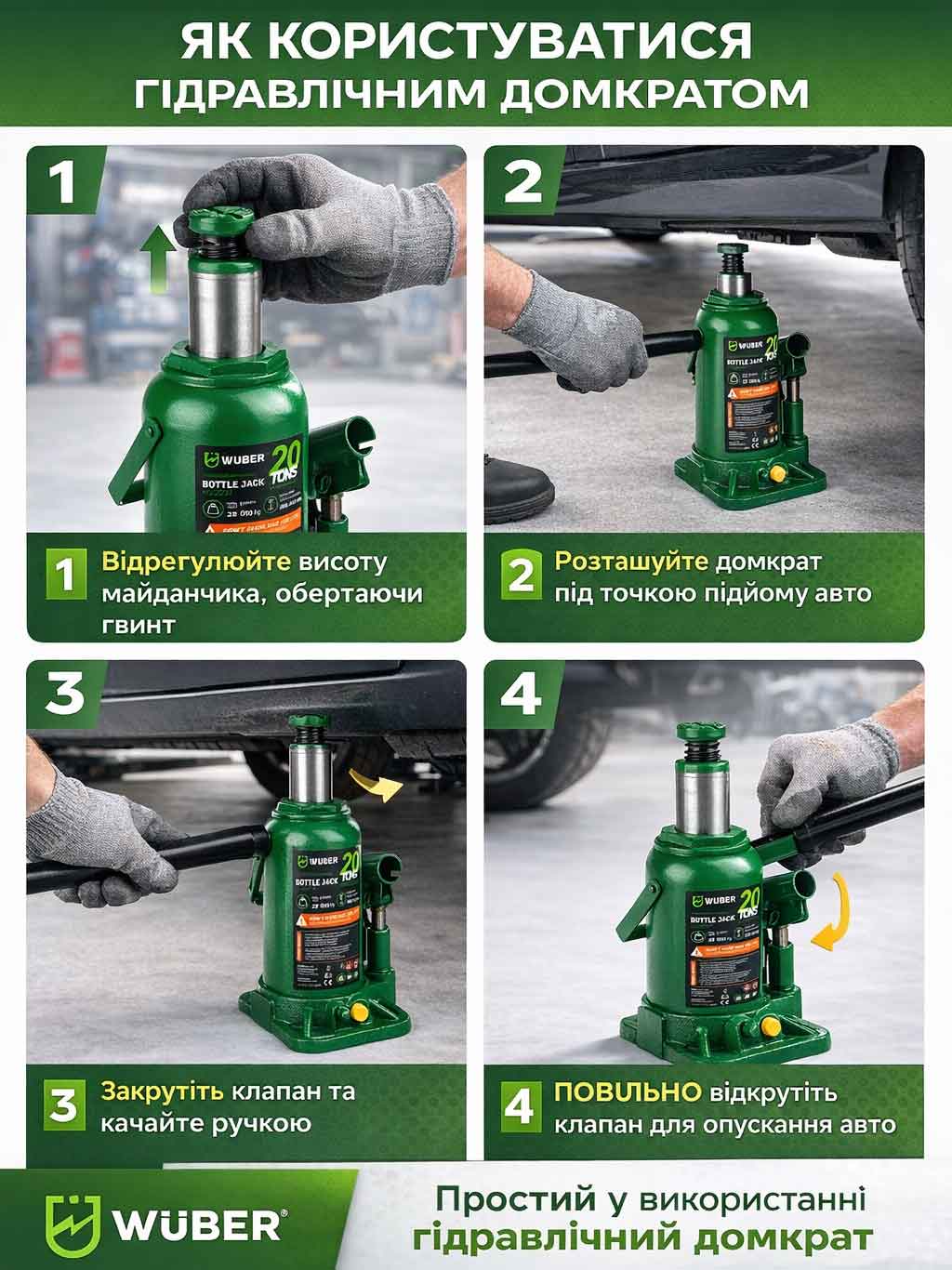 Якщо вам потрібен потужний гідравлічний домкрат для автомобіля, який поєднує компактність, надійність і високу вантажопідйомність, домкрат Wuber 20 тонн стане відмінним вибором для професійного та домашнього використання.