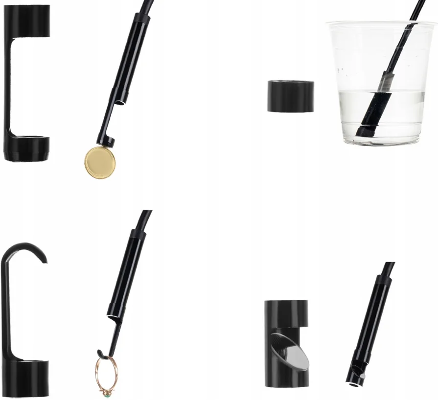 - У КОМПЛЕКТІ 4 НАСАДКИ— у камері аж 4 змінні насадки. У кожного з них своя функція (класичний наконечник, гачок, магніт, дзеркало). Камера під’єднується до довгого кабелю, який дуже гнучкий і міцний. Ви можете легко дістатися навіть до дуже важкодоступних місць і побачити причину несправності.