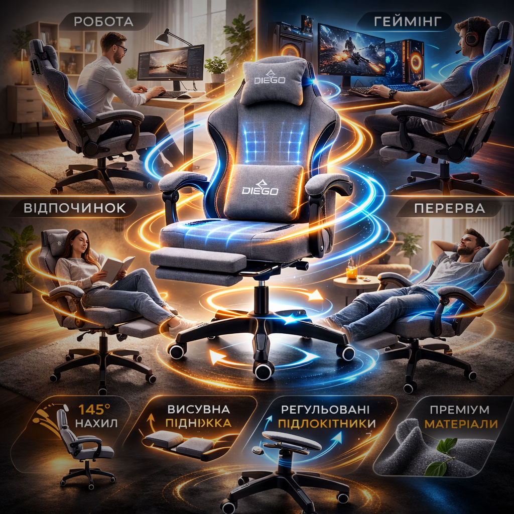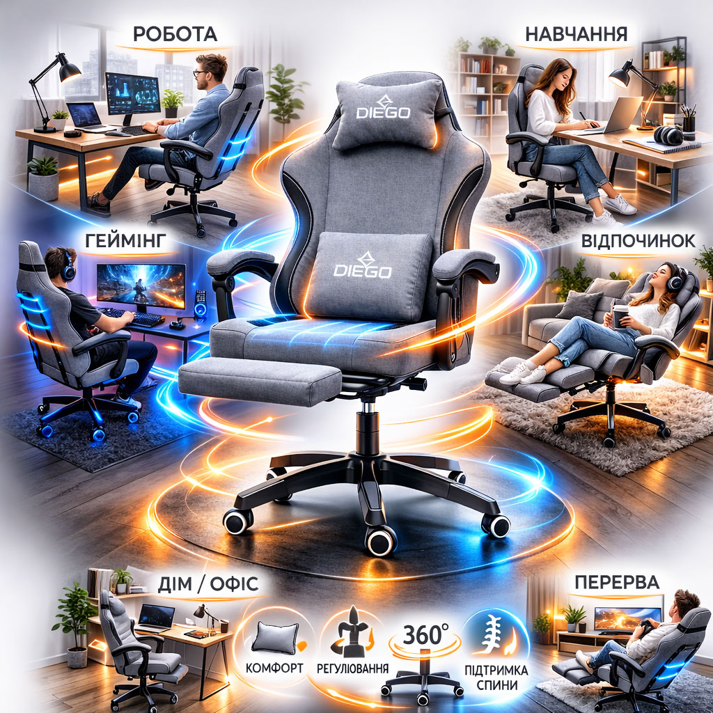 Якщо ви шукаєте геймерське крісло з підставкою для ніг, яке підтримує правильну поставу, зменшує навантаження на поперек і шию та витримує інтенсивну експлуатацію — модель DIEGO G2711 Soft Gray стане оптимальним вибором.