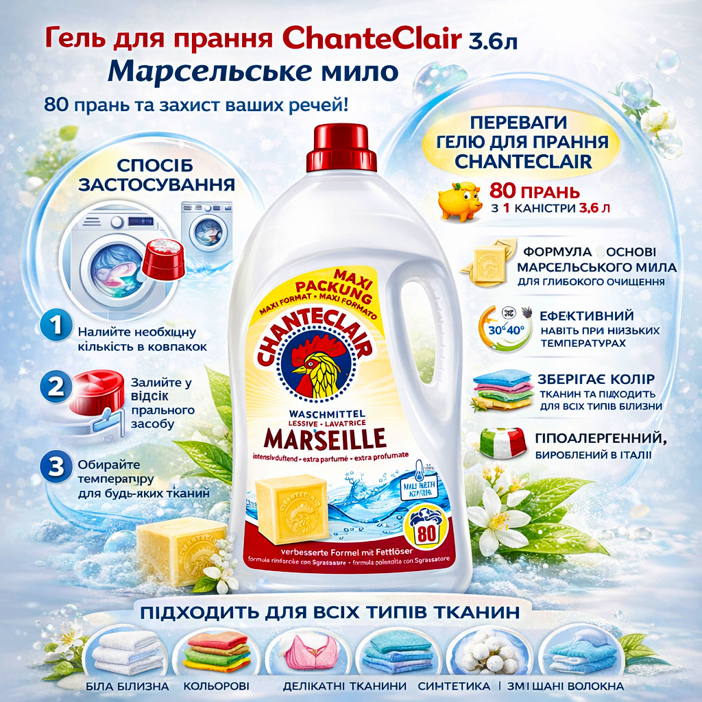Гель для прання ChanteClair 3.6л Марсельське мило 80 прань — універсальний концентрат для ідеальної чистоти
