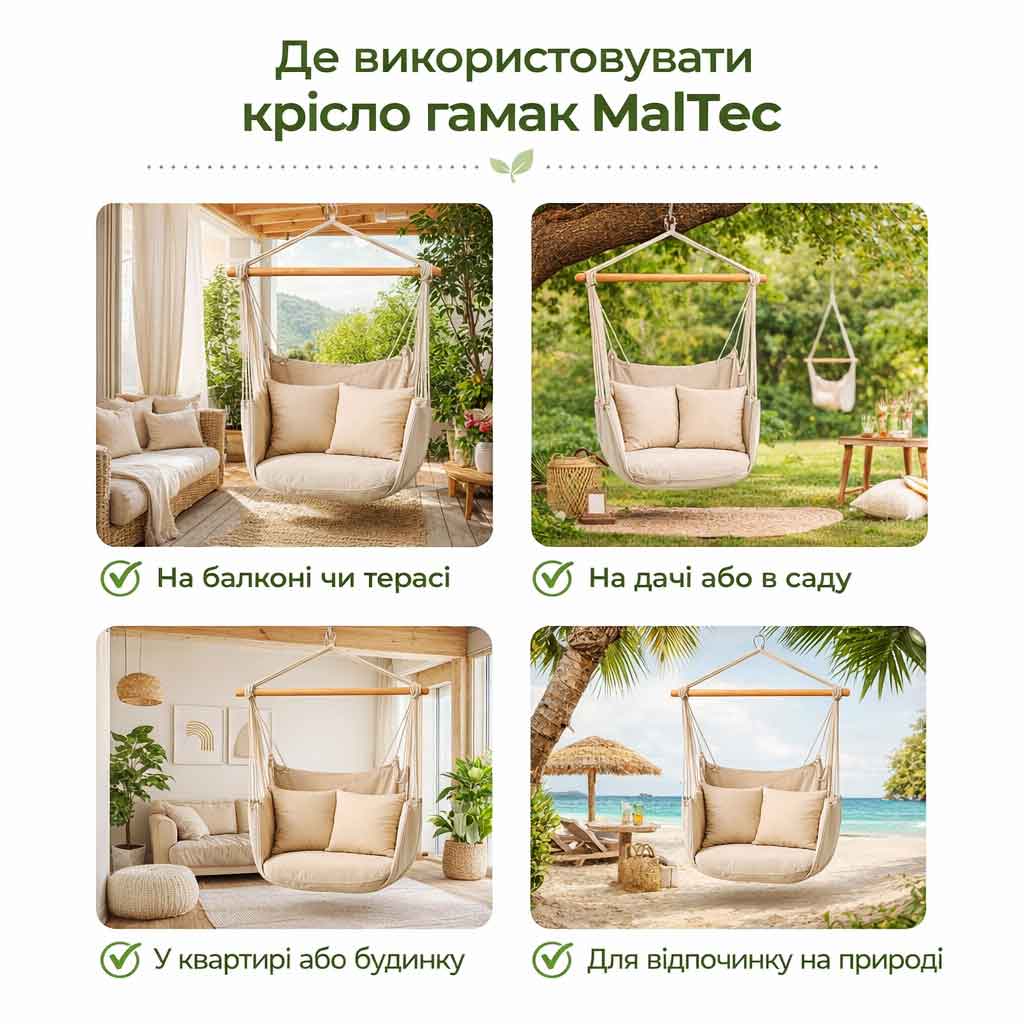 Якщо ви шукаєте якісне, стильне та зручне підвісне крісло гамак — модель MalTec стане оптимальним вибором. Воно поєднує сучасний дизайн, комфорт та довговічність, що робить його ідеальним для щоденного використання.