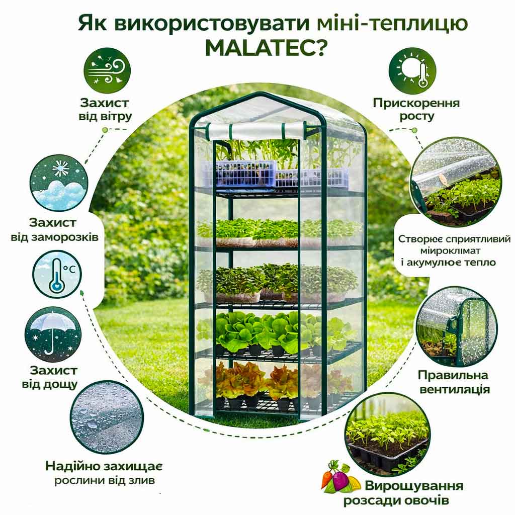 Міні-теплиця з фолії MALATEC забезпечує оптимальні умови для росту рослин навіть у прохолодну пору року. Завдяки щільному покриттю створюється парниковий ефект, який прискорює проростання насіння та підвищує врожайність. Це ідеальний вибір для тих, хто хоче вирощувати екологічно чисті продукти у себе вдома.