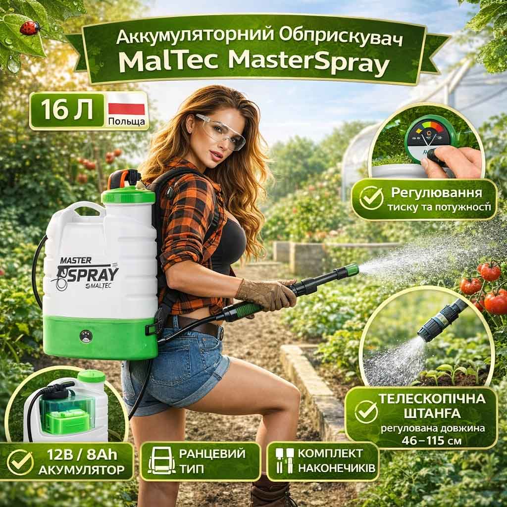 Якщо вам потрібен акумуляторний обприскувач 16 літрів для інтенсивної роботи, Maltec MasterSpray — це оптимальне рішення. Він поєднує потужність, автономність і зручність, що робить його ідеальним для фермерів, садівників і власників великих ділянок.