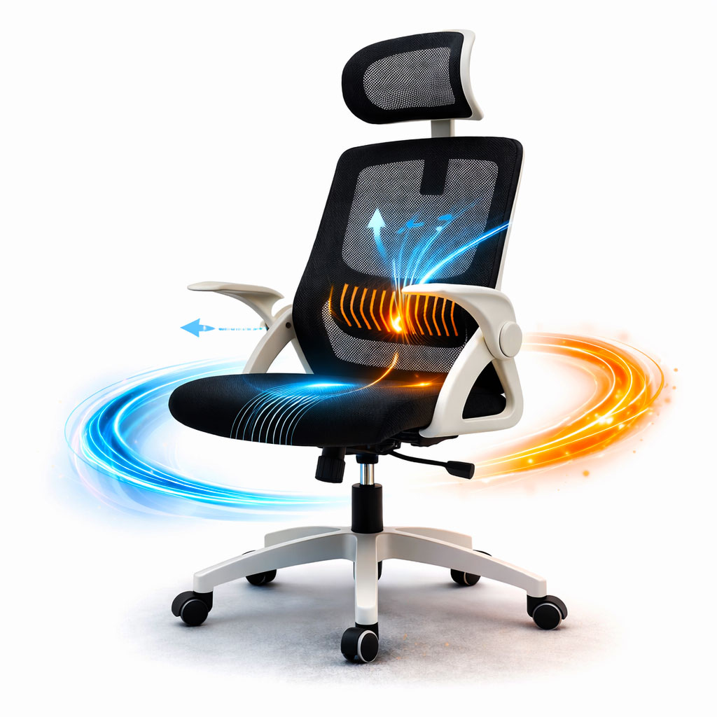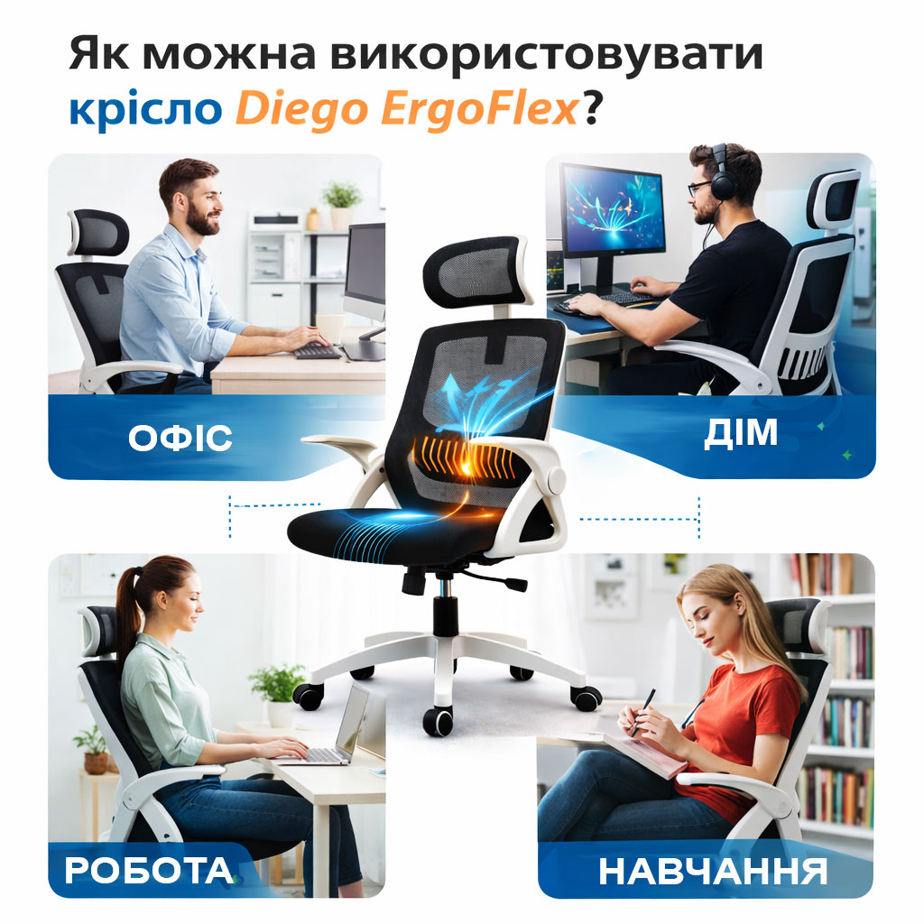 Інфографіка використання офісного крісла Diego ErgoFlex сітка біло-чорне