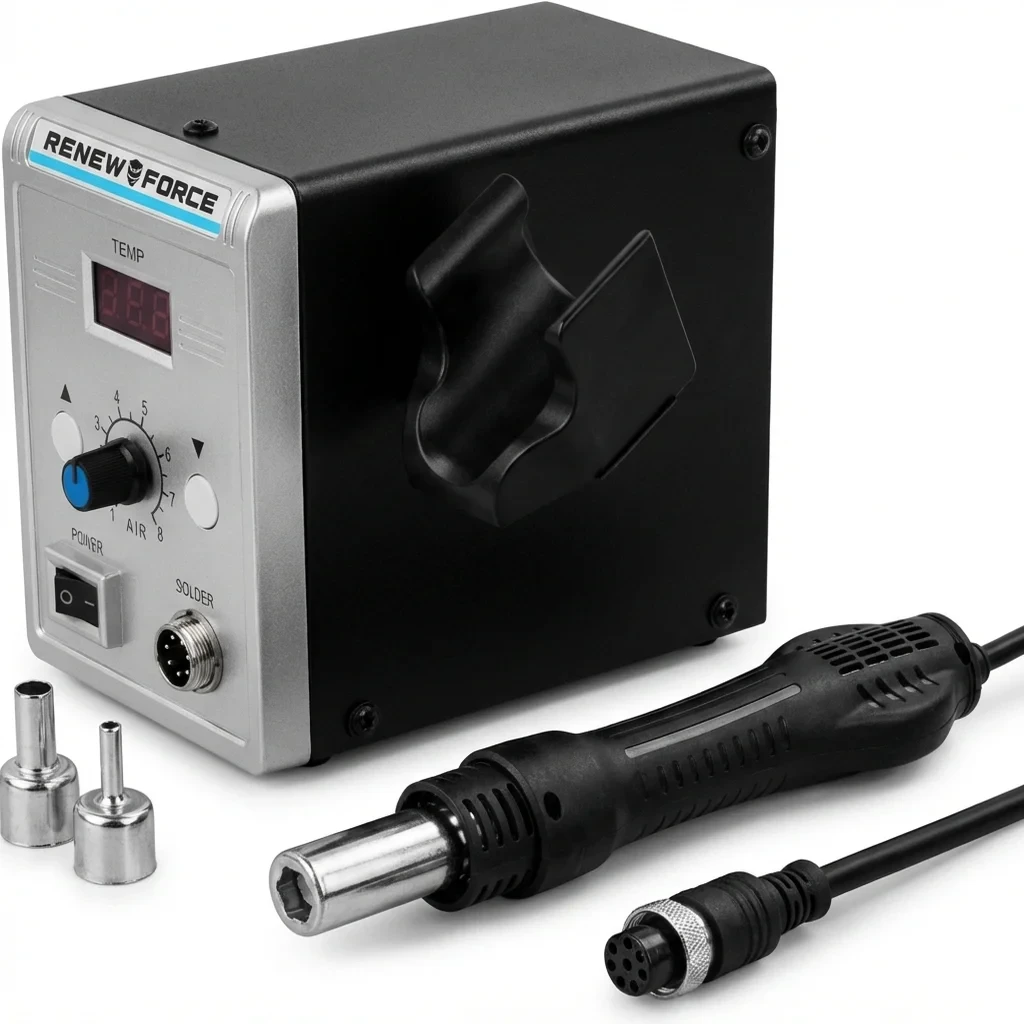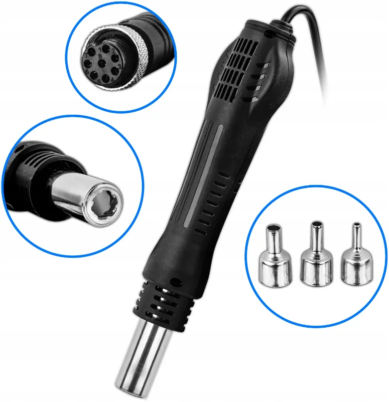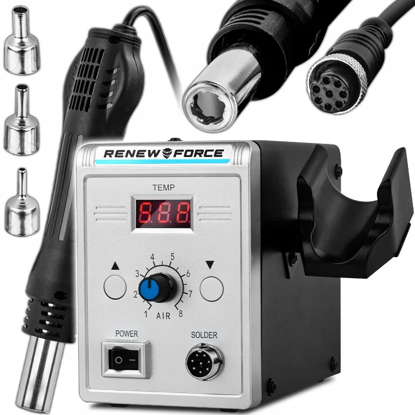 Паяльна станція з гарячим повітрям дає змогу виконувати широкий спектр робіт. ПаяльникHOT-AIR— це сучаснаальтернатива традиційним паяльникам. Завдяки використаннюгарячого повітря замістьпаяльника для розплавлення можна паяти навіть дуже маленькі електронні компоненти в точно заданих місцях. Паяльник такожнезамінний для демонтажу SMD-компонентів. Крім того, прилад використовується якзварювальний апарат для пластику- з його допомогою можна зварювати пластикові компоненти, надаватипластику гарячу форму, стискати ізоляцію й термоусадкову плівку.Набір із 3 змінних насадокдіаметром 3,5 мм, 6,5 мм і 9 мм дає змогу точно настроїти потік повітря для кожного різновиду робіт.