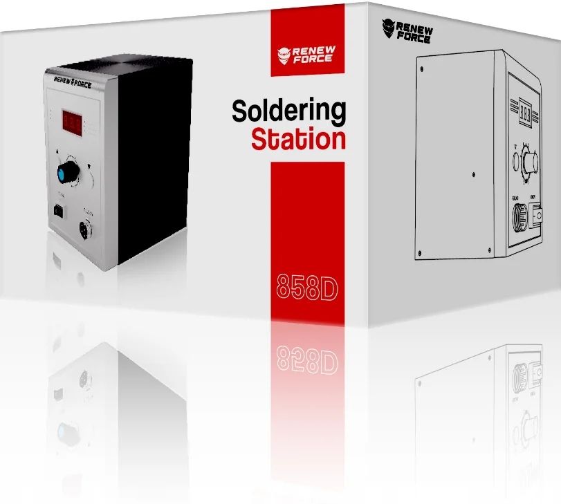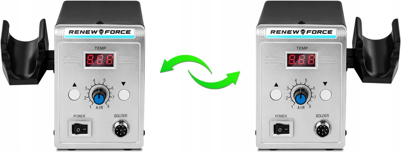 Паяльник обладнанийРК-дисплеємі кнопками дляточного регулювання температури нагріваннявідповідно до ваших потреб. Нагрівання відбувається дуже швидко — приладготовий до роботи вже за кілька секунд. Потенціометр длярегулюванняподаванняповітря, розташований переважно блоку станції, дає змогу плавно регулювати потік повітря.