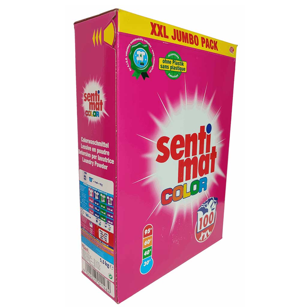 Пральний порошок Sentimat Color XXL 5.5 кг — це професійний німецький засіб для прання кольорових тканин, який забезпечує до 100 прань з однієї упаковки.