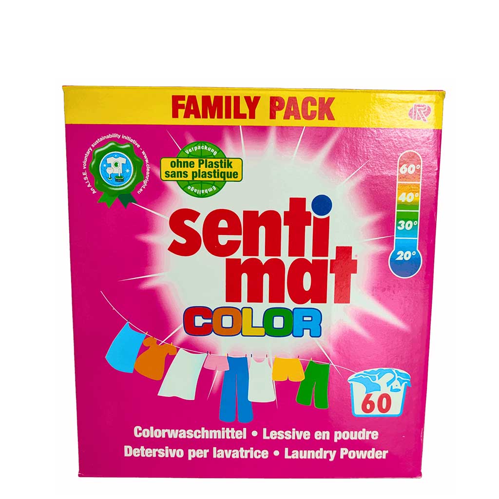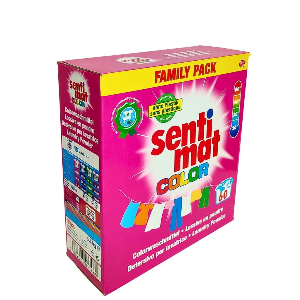 Sentimat Color 3.3kg 60WL — пральний порошок для кольорових речей, який зберігає яскравість тканин, ефективно видаляє плями навіть при низьких температурах та вирізняється екологічною упаковкою без пластику. Оптимальний вибір для щоденного прання вдома, у готелях і пральнях.
