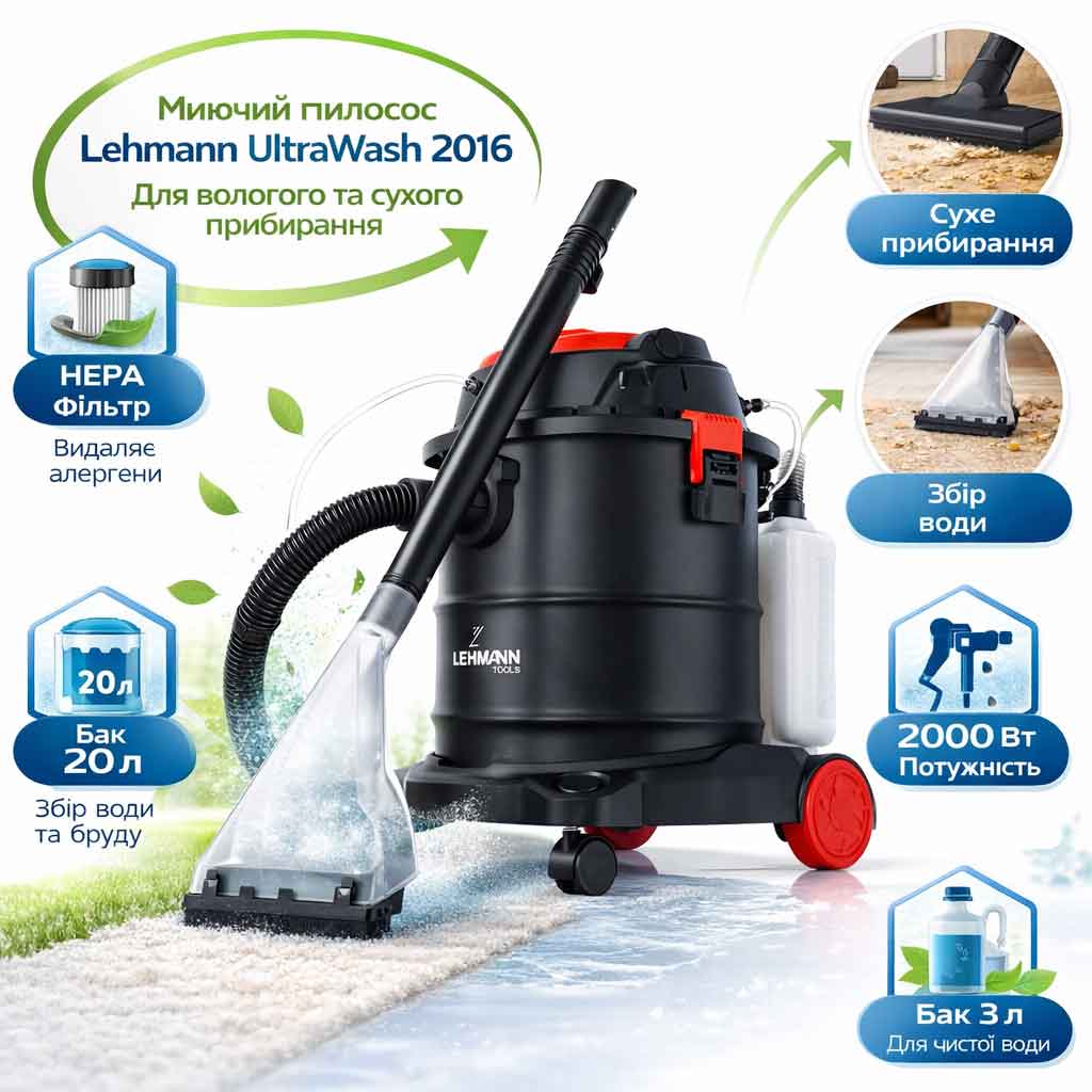 Пилосос миючий Lehmann UltraWash 2016 2 кВт HEPA фільтр 20л — потужний пилосос для вологого та сухого прибирання