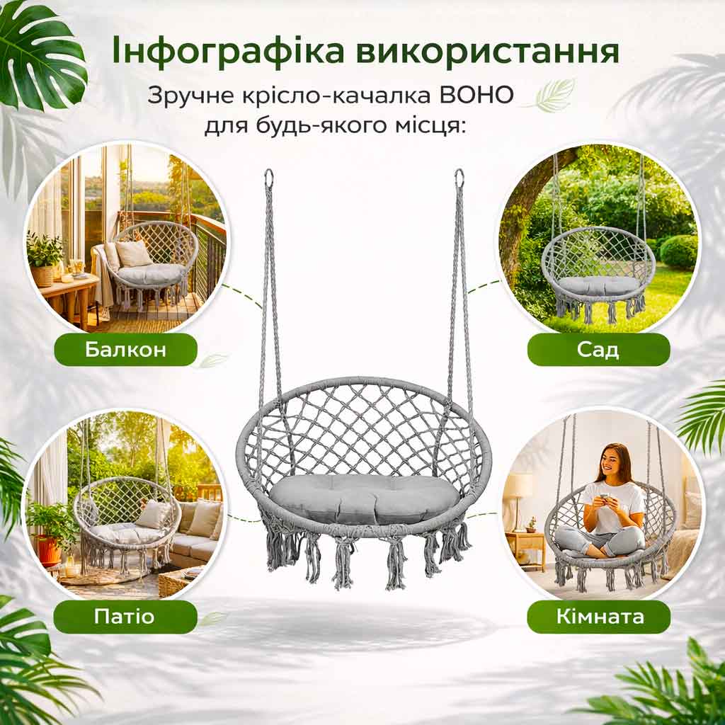 Підвісне крісло-качалка — це не просто меблі, а зона відпочинку. Воно створює