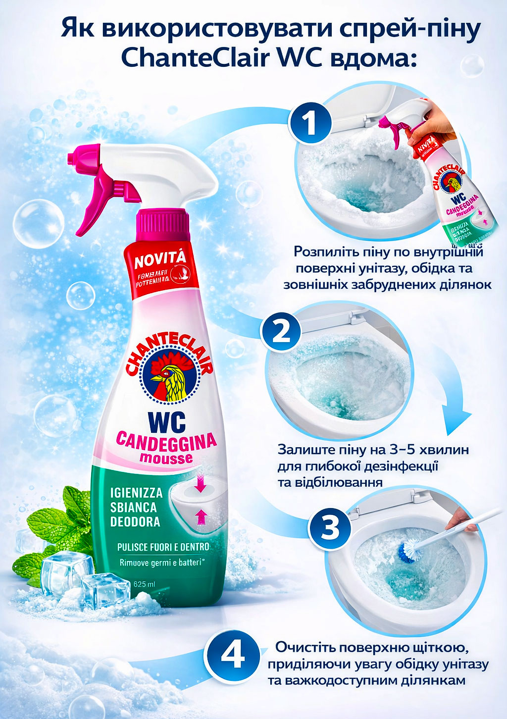 Якщо ви шукаєте ефективний засіб для очищення унітазу з хлором, який забезпечує відбілювання, дезінфекцію та свіжість в одному продукті — спрей-піна ChanteClair WC 625 мл стане надійним рішенням для бездоганної чистоти вашого санвузла.