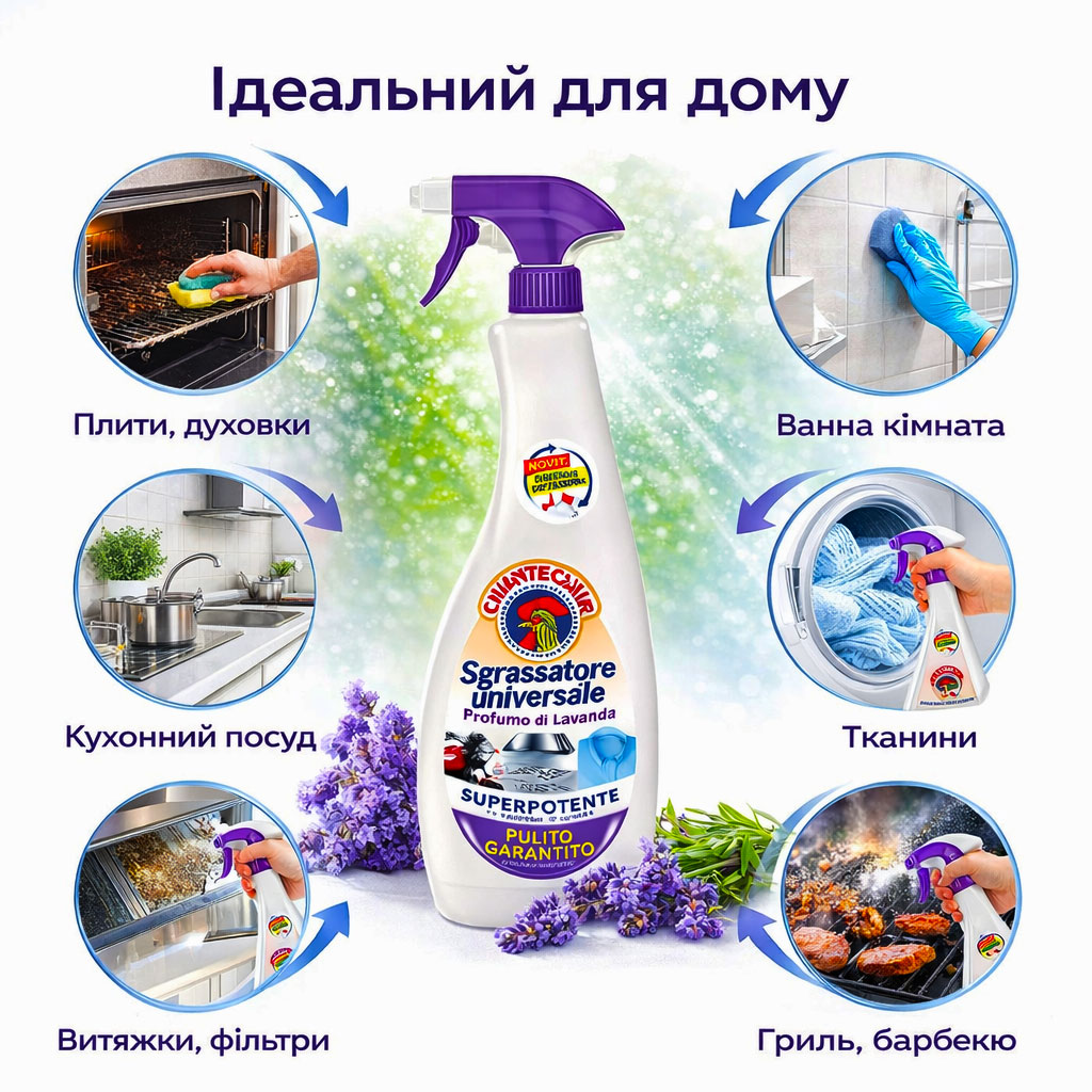 Універсальний обезжирювач спрей ChanteClair Лаванда 600мл – це професійний концентрований засіб для чищення кухні, ванної кімнати та інших поверхонь у домі й на виробництві. Завдяки інноваційній формулі від італійського виробника Real Chimica Srl, спрей ефективно розщеплює жир, масляні плями та складні забруднення, залишаючи приємний аромат лаванди.