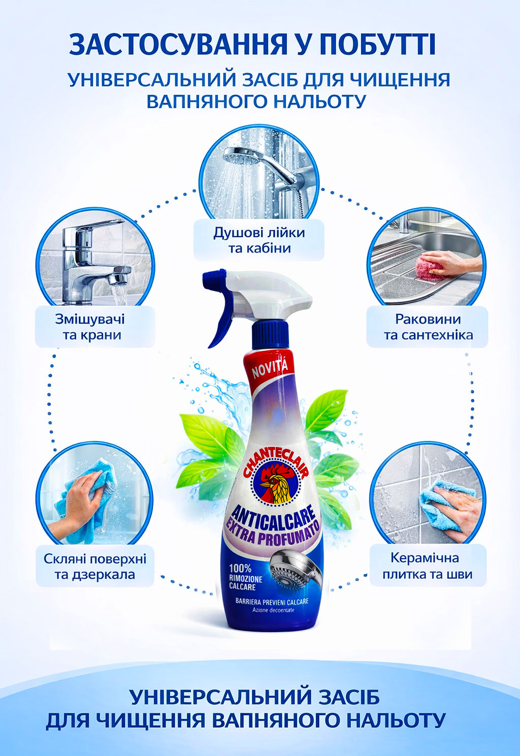 Універсальний засіб спрей для чищення вапняного нальоту ChanteClair 625 мл (CHANTECLAIR ANTICALCARE EXTRA PROFUMATO) – це професійний засіб проти вапняного нальоту з Італії, створений для швидкого та безпечного очищення ванної кімнати та кухні. Формула ефективно розчиняє кальцієвий наліт, мильні залишки та водяний камінь, залишаючи поверхні чистими, блискучими та з приємним ароматом.