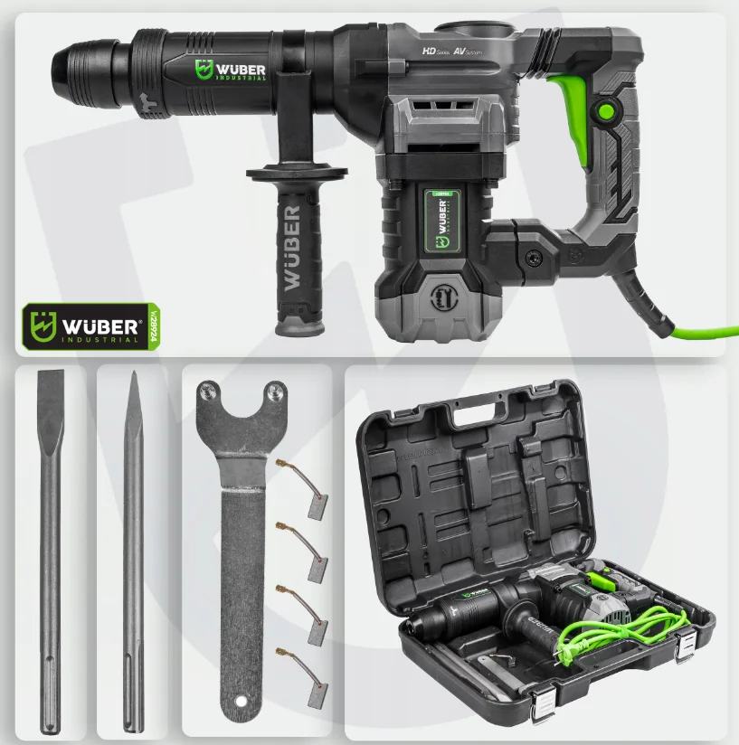 Відбійний молоток Wuber 1200Вт — потужний інструмент для демонтажу бетону. Має антивібраційну систему і зручну ручку.