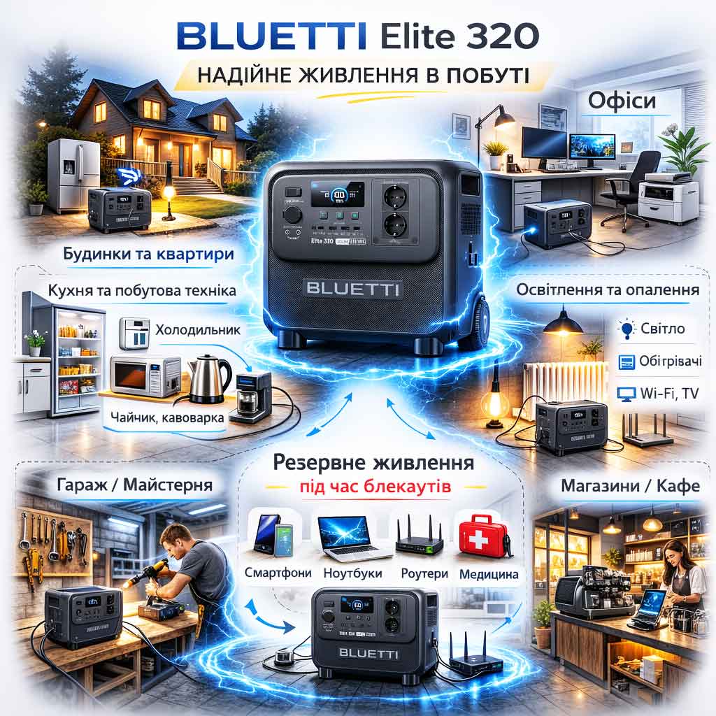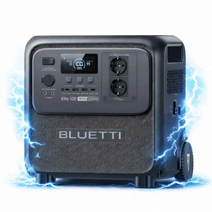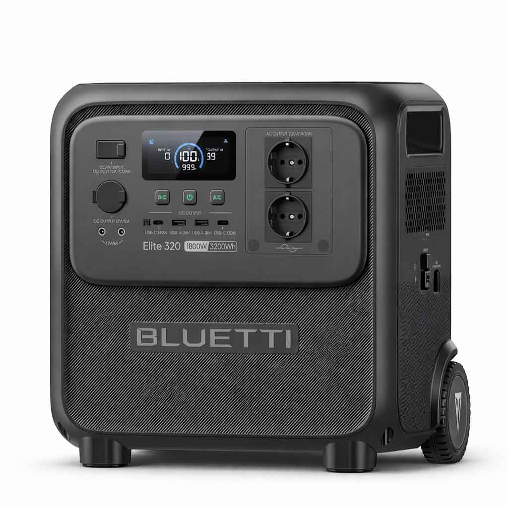 BLUETTI Elite 320 — портативна зарядна станція з акумулятором 3 200 Вт·год на базі LiFePO₄ та номінальною потужністю 1 800 Вт. Підтримує до 9 пристроїв одночасно, заряджається від мережі, сонячних панелей (до 1 000 Вт, MPPT), генератора та авто. Вбудована функція ДБЖ з перемиканням ≤ 10 мс захищає чутливу техніку від відключень. Керування через додаток BLUETTI по Bluetooth/Wi-Fi. Пересувна конструкція з колесами та телескопічною ручкою — надійне автономне живлення для дому, кемпінгу та надзвичайних ситуацій.